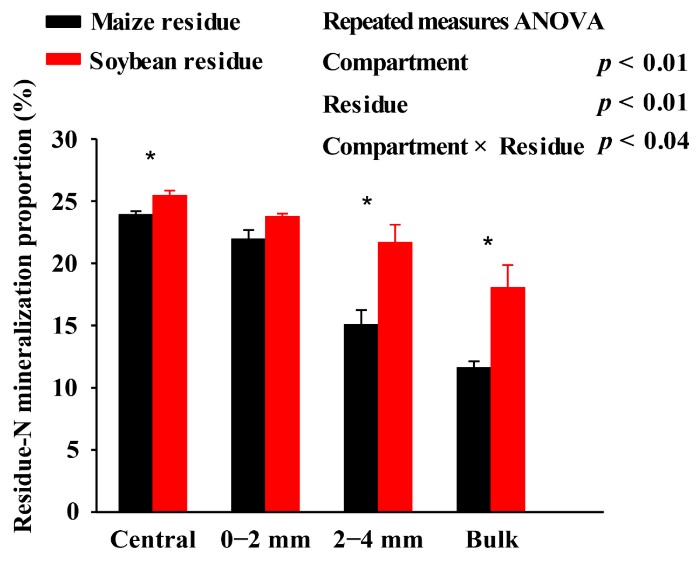 图1. 根箱各隔层土壤中玉米和大豆秸秆氮的矿化比例