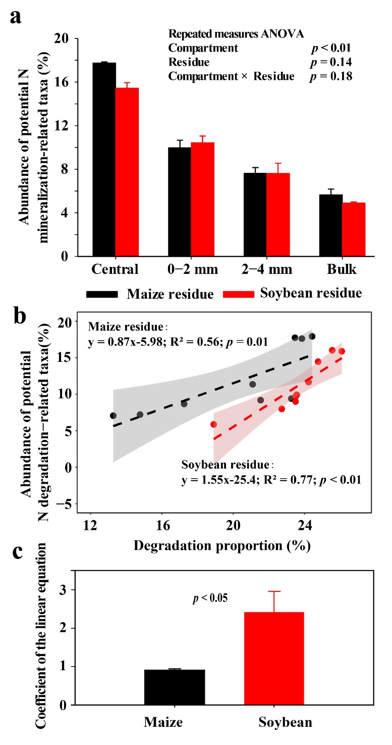 图2. 秸秆氮矿化相关微生物丰度总和(a),玉米和大豆秸秆添加下N矿化微生物相对丰度与秸秆氮矿化的相关关系(b)及斜率(c)