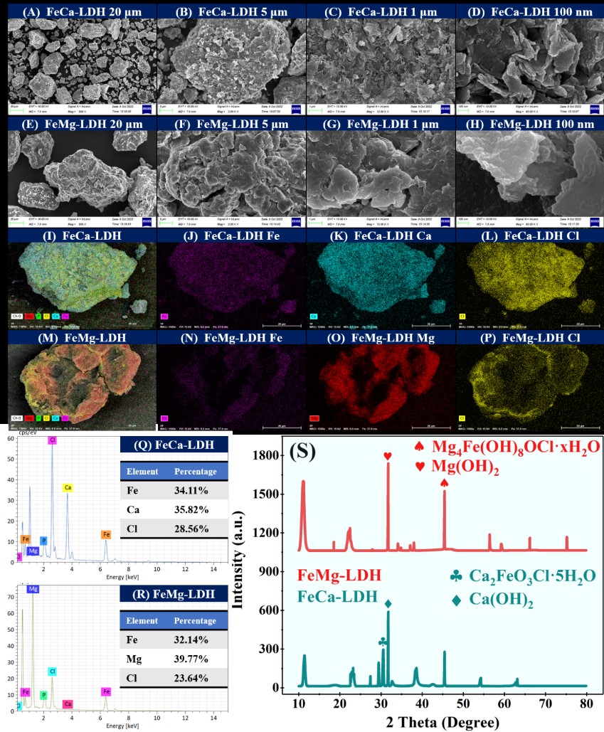 图 2 铁基层状双氢氧化物的结构(A-H:SEM;I-P:EDS;S:XRD)