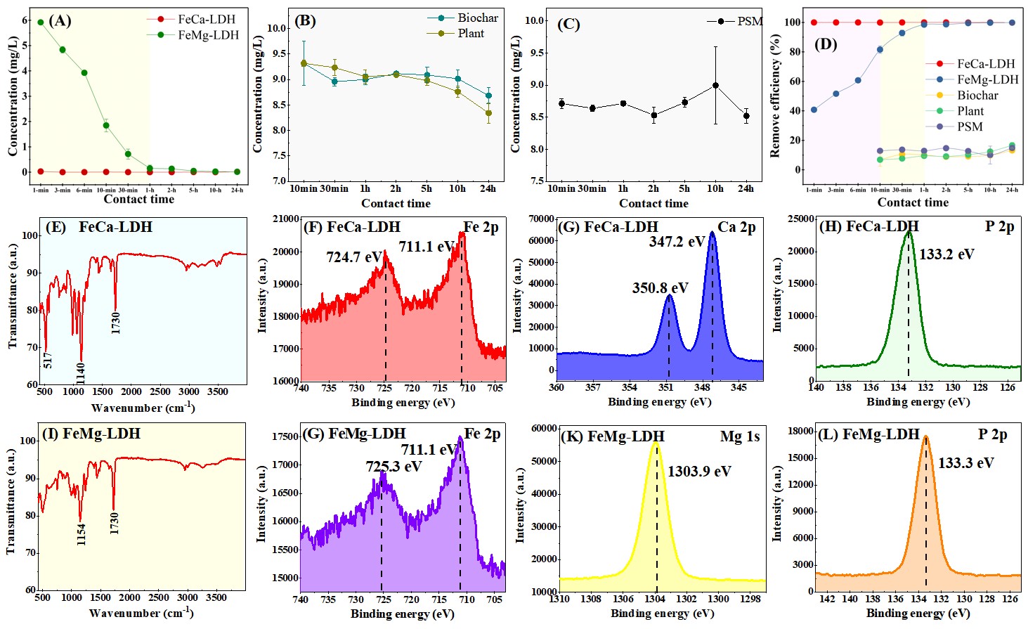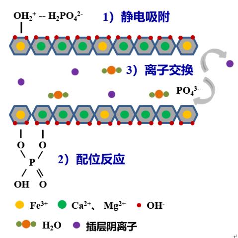 根据水滑石的层状结构特点和层间离子可交换属性,东北地理所水环境污染防治团队通过控制金属阳离子的比例、pH和温度等反应条件,采用共沉淀法成功合成了纯净的铁基层状双氢氧化物(FeCa-LDH、FeMg-LDH)(图1),其通式为[M1-x2+Mx3+ (OH)2]x+ (An-)x/n·mH2O,M2+和M3+是二价和三价金属阳离子,其与OH-共同构成了阳性主体层;A是层间阴离子,常见的有Cl-、SO42-、CO32-、HCO3-和NO3-。FeCa-LDH和FeMg-LDH呈六边形、八面体结构(图2),孔径介于6~18 nm之间,纯度达99%以上。模拟实验结果表明,污水中磷浓度为10 mg/L,LDH添加量为2.5 g/L条件下,相比生物炭、微生物和植物的对照处理,FeCa-LDH和FeMg-LDH对污水中磷的去除率提高了525% - 661%,处理时间缩短至1 min - 1 h (图3)。主要去除机制为静电吸附、配位反应和插层交换(图 4)。研究还发现,碱性条件下FeCa-LDH的除磷率可提高50%左右,但共存阴离子碳酸氢根对磷的去除率有轻微的抑制作用。FeCa-LDH材料的重复利用性良好,循环使用第5次时的磷去除率仍可达85%。该材料也具有良好的浓度波动抗冲击性能,污水中磷浓度为600 mg/L时,磷的去除率为62%,可应用于突发污染事故的应急处理中。