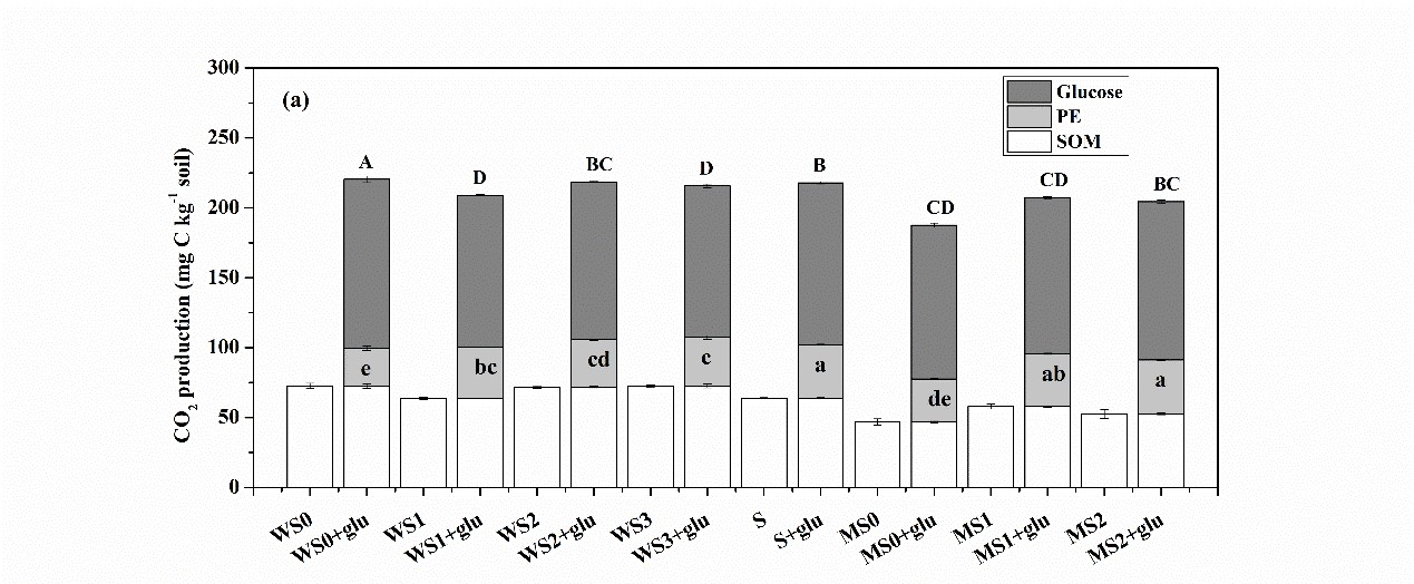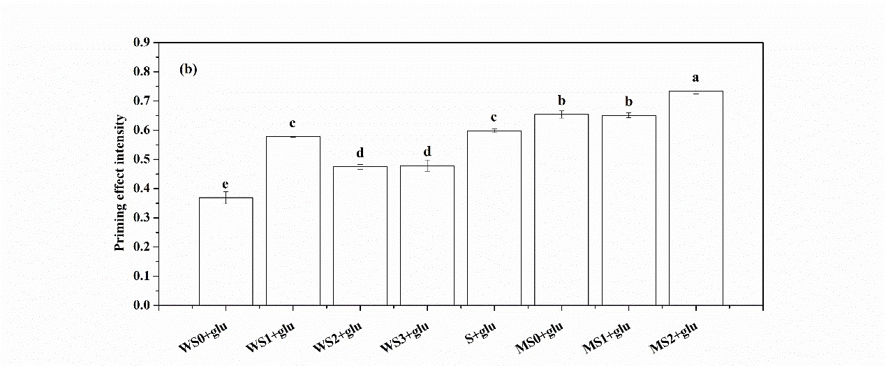 研究表明,在连作系统中,小麦连作土壤具有最高的土壤有机碳矿化速率,其次是大豆连作,玉米连作的土壤有机碳矿化速率最低。与未添加葡萄糖的处理相比,葡萄糖添加分别使小麦和玉米轮作系统中土壤累积碳矿化增加了195%–230%和255%–300%(图1a)。大豆参与的小麦和玉米轮作系统中,葡萄糖添加引起的激发效应分别比小麦和玉米连作增加了27%–38%和22%–26%,但大豆种植频率对小麦和玉米轮作系统中PE的影响不显著(图1)。在小麦和玉米轮作系统中,大豆的参与增加了土壤C/N比及真菌生物量,降低了土壤细菌/真菌的比值,促进了土壤激发效应的强度(图2),但大豆种植频率对土壤有机碳激发效应的影响不显著。研究结果为通过调整豆科作物参与的轮作体系促进土壤碳固定提供了科学依据。