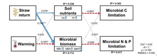 研究表明,短期增温和秸秆还田除对土壤全氮含量具有显著影响外,对其它基本土壤理化性质无显著影响。秸秆还田显著增加了土壤微生物生物量碳和细菌丰度(16S基因拷贝数),而增温显著降低了土壤微生物生物量碳和细菌丰度。秸秆还田显著缓解了微生物磷限制,但增温和秸秆还田耦合削弱了这一作用效果(图1)。增温和秸秆还田主要通过土壤养分含量变化影响微生物碳限制,通过影响微生物生物量进一步调控微生物氮磷限制(图2)。研究结果阐明了增温和秸秆还田耦合对土壤微生物养分限制的影响机制,进一步加深了对温带农田生态系统养分循环的认识。