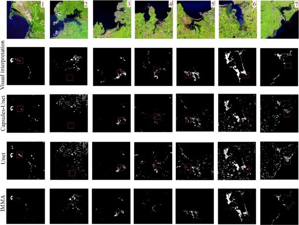 图 红树林遥感识别方法IMMA与深度学习分类结果的比较。其中,目视解译、Capsules-Unet、Unet结果均来自于Guo et al. (2021)。