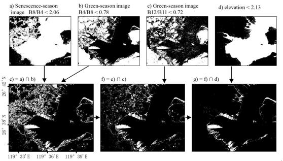 结果显示,新方法可以高效构建生长季和枯黄季构成的双时相影像、有效减少误分类像元、等效逼近已训练随机森林模型。此外,本研究提供了一套总体精度92.5%的10米分辨率2020年海岸盐沼植被分布数据,还构建了针对双时相影像识别海岸盐沼植被的潜在机理,即生长季的水信号被植被掩盖、枯黄季植被枯萎后水信号得到增强。针对双时相影像识别海岸盐沼植被分布的潜在机理,进一步解析决策规则的各组成部分的作用。发现:枯黄季B8senescence/B4senescence < 2.06 对包含盐沼植被的高含水率土地覆被响应,生长季B4green/B8green < 0.78 对包含盐沼植被的低含水率土地覆被响应,二者的交集已有效包含盐沼植被(图2)。剩余部分决策规则分别作用于去除不透水面和水体。可以推测,双时相影像下盐沼植被冠层导致的水信号变化或是其遥感识别的潜在机理。