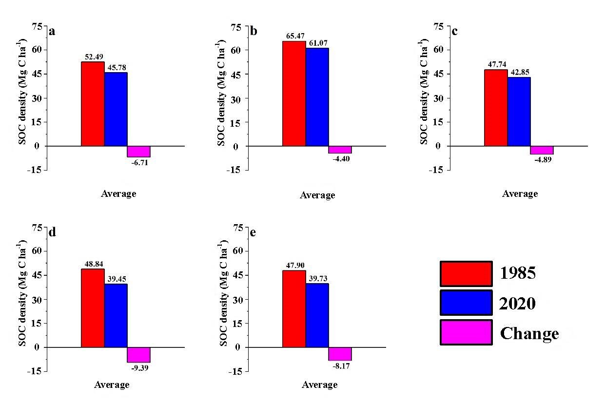 图1东北地区35年来土壤有机碳密度变化(a代表东北地区;b代表黑龙江省;c代表吉林省;d代表辽宁省;e代表内蒙古)