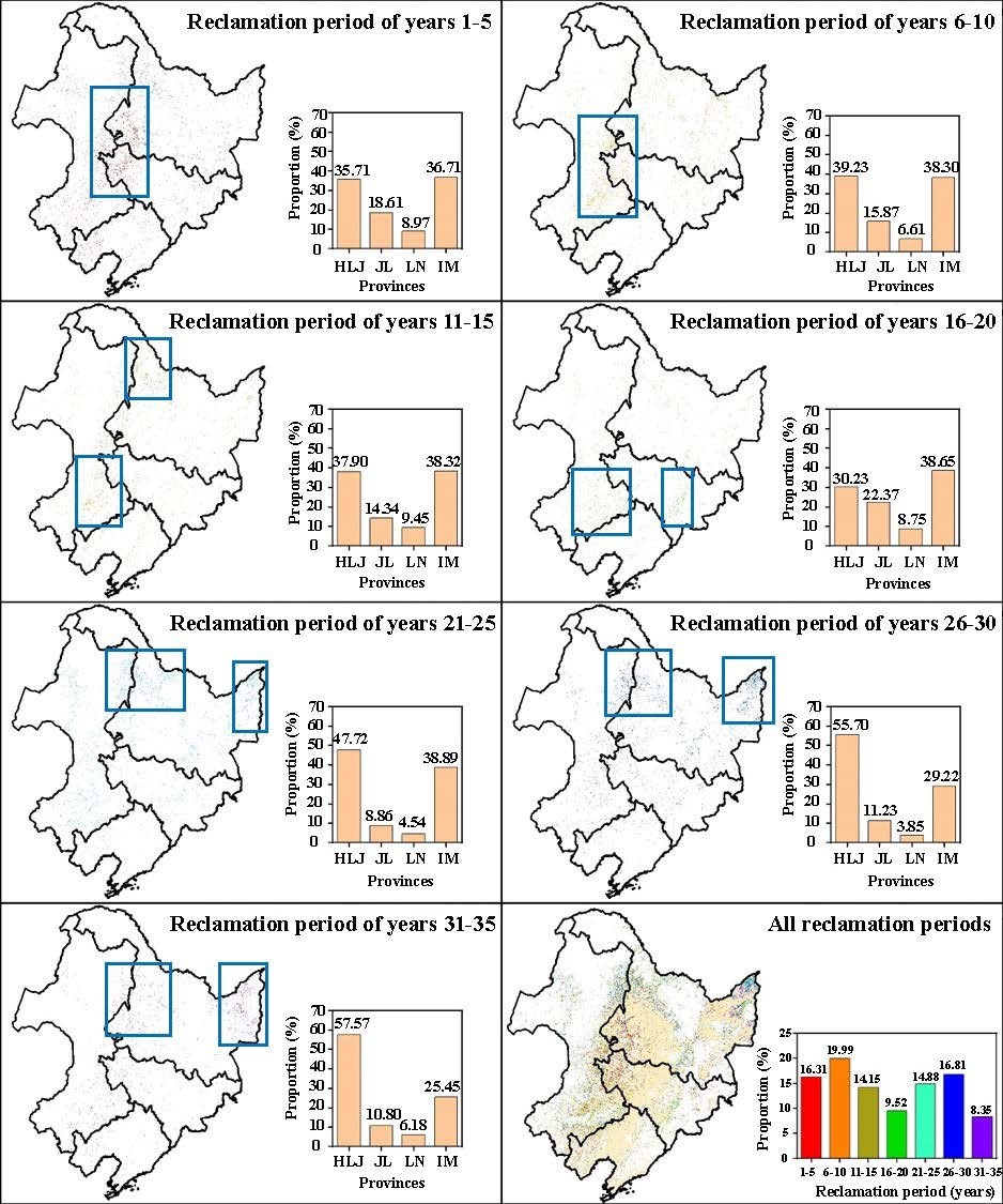 图2东北地区耕地开垦结果(蓝色边框表示不同开垦年限大范围分布区域)