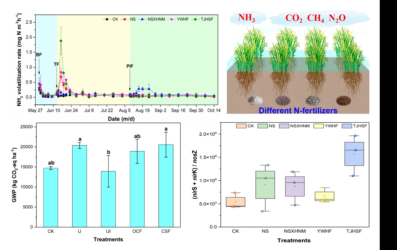 东北地理所水环境污染与防治团队以吉林西部盐碱稻田土壤作为研究对象,通过中宇宙试验,评估了不同盐碱水平与不同氮肥施用条件下稻田NH3挥发和GHG排放特征,并阐明了驱动碳氮气体排放的微生物学机制。