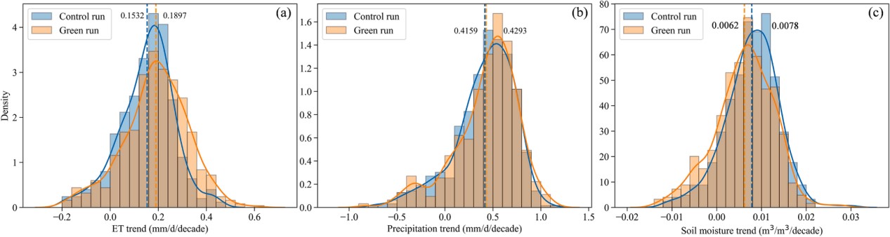 图2. 2001-2020年东北地区农田生长季蒸散、降水和土壤水分变化趋势核密度图(农田变绿:橙色,控制实验:蓝色)