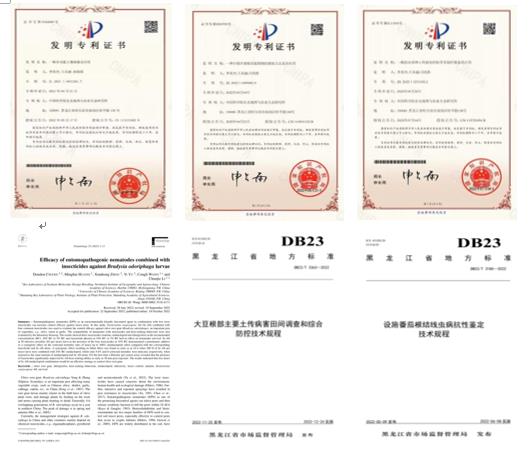 第三,科研骨干从寒区黑土农田中分离和筛选了两株有益细菌,具有增加大豆根瘤量、利于固氮的功能,对大豆根腐病防效达57.6%,对大豆胞囊线虫病防效最高达81.8%;同时具有促进植株生长功能,其对蔬菜根结线虫病防效达70%以上。这两株细菌已经获得国家发明专利,并制定了黑龙江省地方标准,为规范大豆根部病害的田间调查方法和科学防控提供了必要的技术规程。