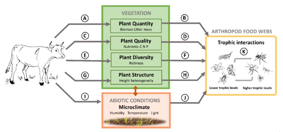 节肢动物(包括昆虫)种类丰富、数量庞大,分布于食物网多个营养级,在维持生态系统功能和服务方面发挥关键作用。大型草食动物是陆地生态系统的重要组成部分,通过采食、践踏、排泄物返还等途径对植物和动物群落产生深远影响。然而大型草食动物对节肢动物食物网的影响及其关键调控机制尚不清楚。