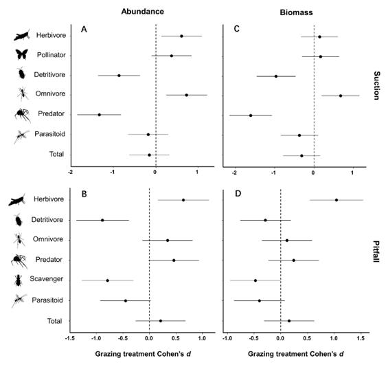 研究发现大型草食动物没有对植物冠层和地表活动的节肢动物总数量产生显著影响,但降低了植物冠层节肢动物总生物量(17%),增加了地表节肢动物总生物量(13%)。大型草食动物对节肢动物的影响取决于节肢动物不同营养级水平:放牧显著增加植食者、传粉者、杂食者和地表捕食者的数量和生物量,但显著降低了分解者、食腐者、寄生者以及植物冠层的捕食者的数量和生物量(图2)。