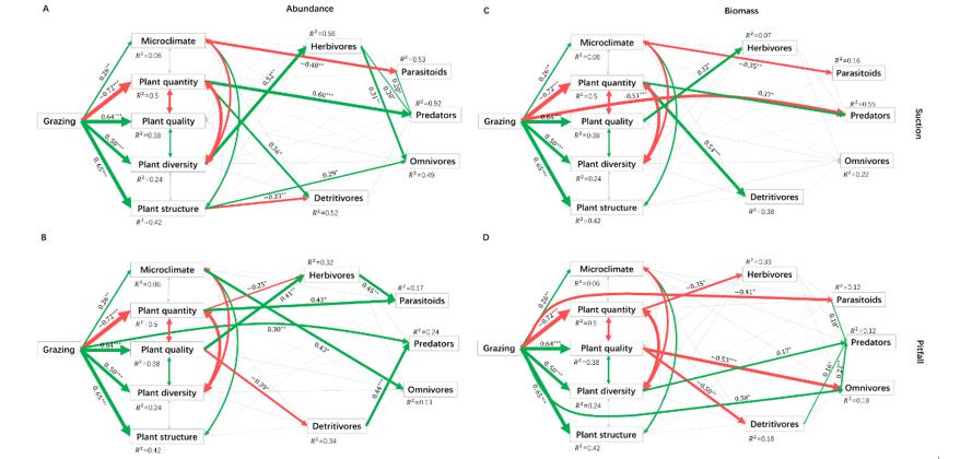 结构方程模型进一步揭示了大型草食动物对节肢动物食物网的驱动机制:放牧可以通过提高植物质量促进植食者,通过增加植物多样性促进地表捕食者;通过减少植物生物量降低植物冠层捕食者,通过改变微气候条件抑制寄生者(图3)。该研究可为节肢动物多样性保护、大型草食动物放牧管理和生态系统保护修复提供理论依据。