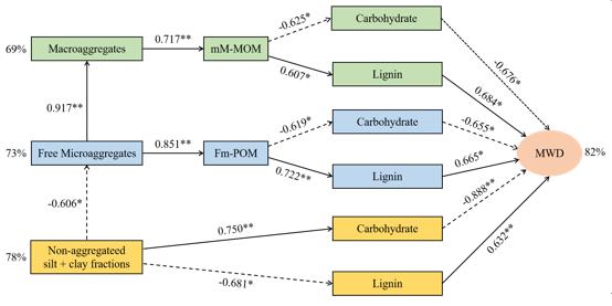 为此,中国科学院东北地理所土壤资源与利用学科组科研人员以2004年建立的模拟气候变暖的空间移位试验为研究对象,将初始不同有机质含量的黑土从高纬度空间移位到低纬度,利用土壤团聚体的物理-化学联合(团聚体-密度)分级、傅里叶变换红外光谱、核磁共振和分子混合模型等手段,探索了长期气候变暖对黑土活性和惰性有机碳组分的含量、分子结构和团聚体稳定性的影响及其潜在机制。研究结果发现,长期气候变暖会提高初始有机质含量较高的黑土有机碳含量,增加黑土溶解性有机碳、游离微团聚体有机碳和非团聚的粉黏粒有机碳含量;但是会降低易氧化有机碳、微生物生物量碳、“大团聚体中-微团聚体内的粉黏粒”有机碳含量以及土壤团聚体稳定性。气候变暖增加了“游离微团聚体”和“非团聚的粉黏粒组分”中颗粒有机质的比例和有机碳含量,却降低了“大团聚体中-微团聚体内的粉黏粒组分”的比例和有机碳含量;更重要的是,土壤团聚体稳定性与以上三种组分中的碳水化合物含量呈正比,而与其木质素含量呈反比(图1)。研究结果说明土壤大团聚体和非团聚的粉黏粒有机质中矿物结合的化学保护,以及游离微团聚体内颗粒有机质中闭蓄作用的物理保护可能是长期气候变化下黑土有机碳稳定的主要机制(图2)。