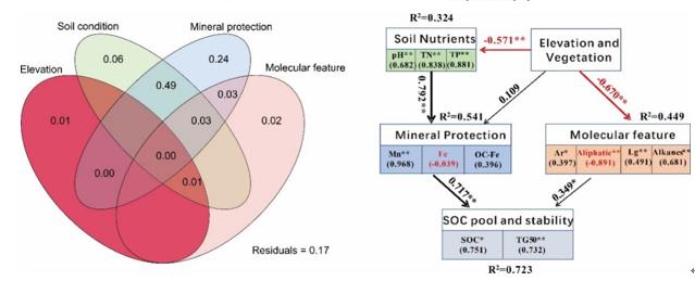 土壤碳库稳定性维持是目前土壤学研究的核心与难点。长期以来,惰性分子化学抗性与矿物选择性保护被认为是两种主要碳库稳定性维持机制,哪种机制更为重要目前学术界尚未形成共识。山地生态系统的植被与土壤在垂直方向上具有梯度变化,为揭示碳库稳定性维持机制,识别主要控制因素提供了天然的实验场所。