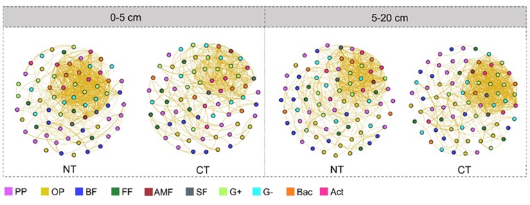 图2不同耕作方式下表层土壤和底土生物关联的网络图。
