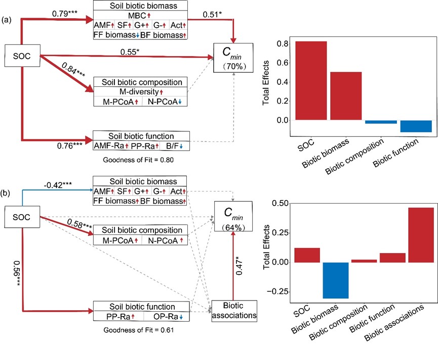中国科学院东北地理与农业生态研究所黑土有机碳与保护性耕作学科组科研人员依托吉林省德惠市始建于2001年的保护性耕作长期定位实验开展了相关研究。意在阐明土壤潜在碳矿化对长期保护性耕作的响应模式,并探究不同土壤深度下潜在的生物机制。结果表明,与常规耕作相比,秸秆覆盖还田保护性耕作显著提高了表层土壤(0-5 cm)的潜在碳矿化速率,而降低了底土(5-20 cm)的碳矿化速率(图1)。结构方程模型表明,增加的土壤有机碳可以直接或通过提高表层土壤生物的生物量来促进土壤碳矿化,而在底土中,土壤潜在碳矿化速率的增加主要是通过生物关联的加强来实现的(图2和图3)。这些发现为土壤生物群落在碳矿化中的作用提供了新的见解,并强调了不同土壤深度下土壤碳矿化对耕作方式的响应机制不同。