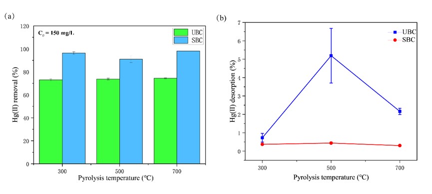 图1未改性生物炭(UBC)和改性生物炭(SBC)的Hg(II)去除率和解吸率