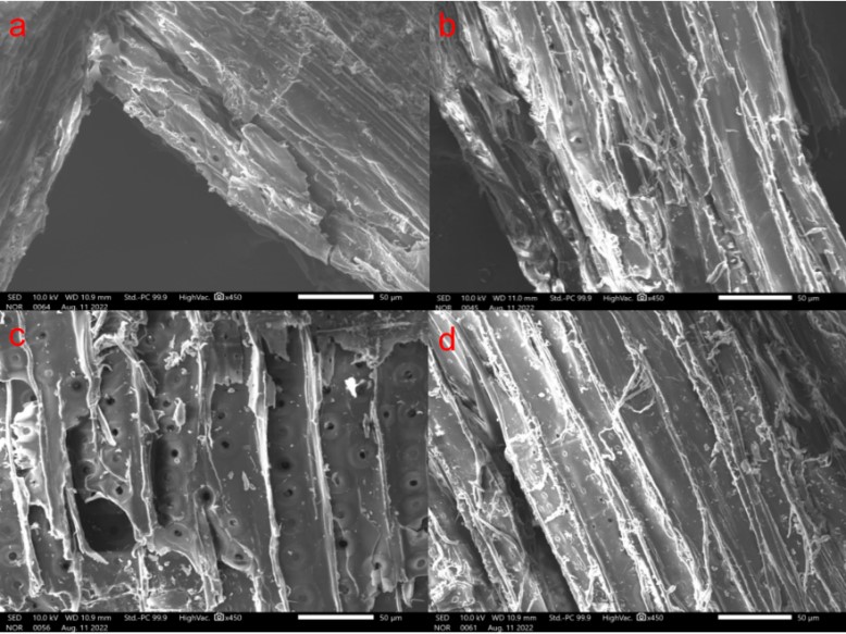 图2UBC300(a,b)和SBC300(c,d)吸附前(a,c)和吸附后(b,d)的SEM图像