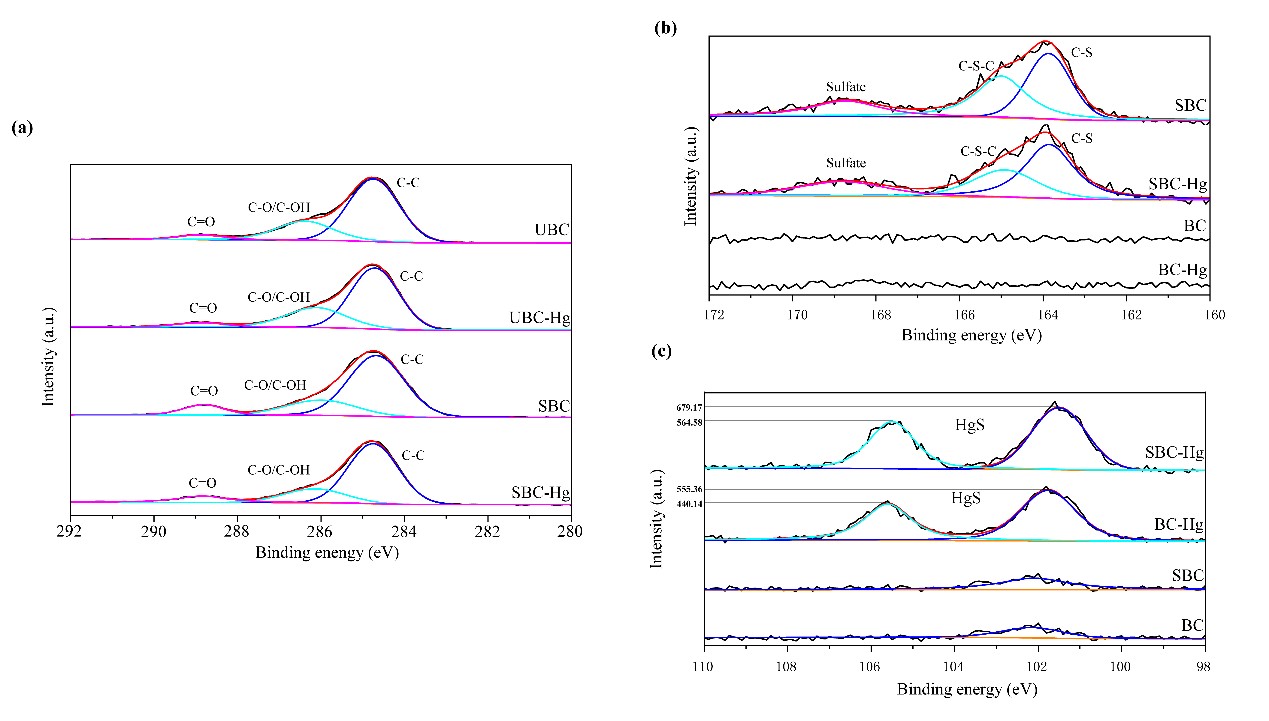 研究结果表明:在300℃条件下制备的硫化钠改性生物炭(SBC300)相比500℃和700℃有着更高的Hg(II)去除能力,对模拟废水中Hg的去除率高达96.4%,对实际废水中Hg的去除率高达70.2%。通过解吸实验、动力学实验以及SEM和XPS表征,发现SBC300的Hg净化机制主要为表面吸附和C-S,C-S-C官能团与Hg(II)在表面形成稳定的HgS沉淀,且解吸率极低,表明SBC300吸附Hg后具有较高的稳定性。通过制备工艺能源与原材料消耗、产率、去除率及稳定性三方面评估发现,利用SBC300从废水中去除1g汞的成本仅为1.74美元,与未改性生物炭相比经济性提高24.7%。