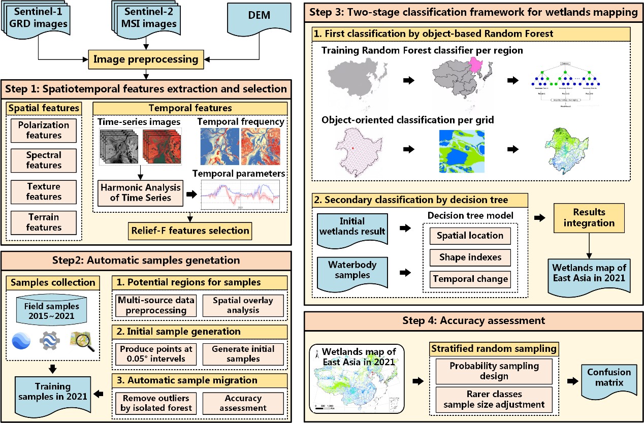 针对上述问题,在遥感大数据和云计算平台(Google Earth Engine)的支持下,东北地理所湿地遥感、地理景观遥感研究团队以东亚地区为研究范围,研发了一种集成随机森林机器学习算法和层次决策树分类算法的“两段式”的大尺度湿地分类框架方法。利用多源参考数据和21万多景Sentinel-1/2时间序列遥感影像,完成了东亚地区首套10米空间分辨率、多类型(3大类、12小类)的湿地空间分布图(EA_Wetlands,2021),精度达88%以上。
