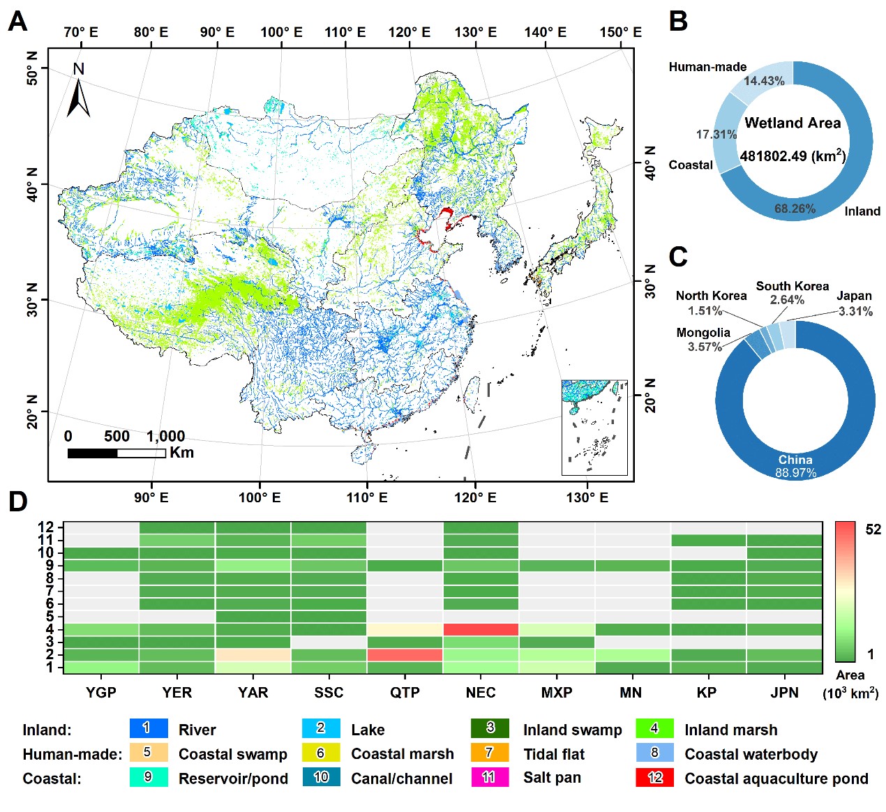 研究结果表明,2021年东亚地区的湿地总面积为 48.18万 km2. 主要分布在中国东北地区和青藏高原地区(占比41.02%)。东亚地区的湿地类型以内陆湿地为主(68.26%),其次为滨海湿地(17.31%)和人工湿地(14.43%)。在12个湿地二级类型中,内陆草本沼泽所占比例最高(29.67%),其次是湖泊(20.98%),滨海木本沼泽所占比例最低(0.07%)。在东亚地区各个国家中,中国的湿地面积所占比例最大(88.97%),其次为蒙古国(3.57%)。韩国的湿地面积占国土面积的比例最大(10.43%)。