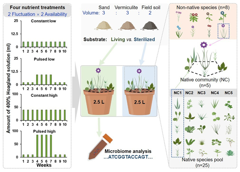 中国科学院东北地理与农业生态研究所生物入侵生态学团队开展了一项多物种的温室盆栽实验,用以检验上述假设(图1)。在此实验中,八种外来入侵植物被置于盆栽中心,与五种不同的本地群落进行竞争。然后,对这些盆栽分别进行养分波动(恒定vs.脉冲) 养分可利用性(低vs.高) 土壤微生物(不灭菌vs.灭菌)的全因子处理。
