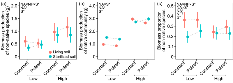 图2 不同处理组合下非本地植物的地上生物量(a)、本地植物群落地上生物量(b)和非本地植物的地上生物量占比(c)