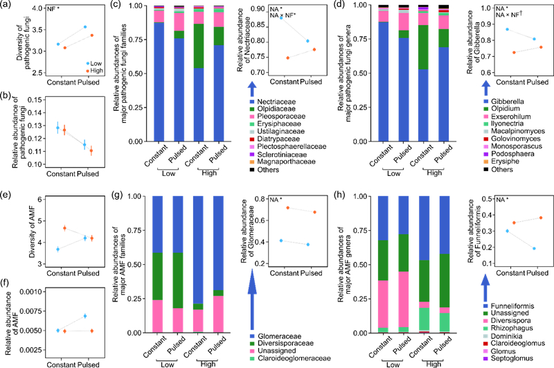图3 不同养分可利用性水平下养分波动对土壤病原真菌和AMF的多样性及相对丰度的影响