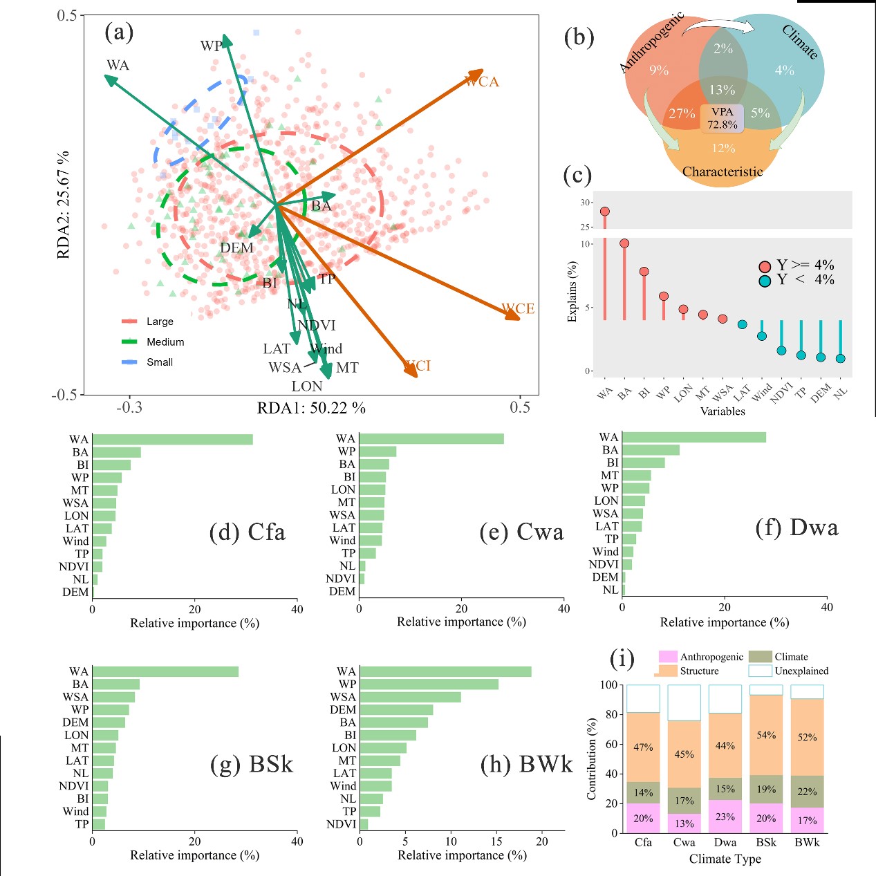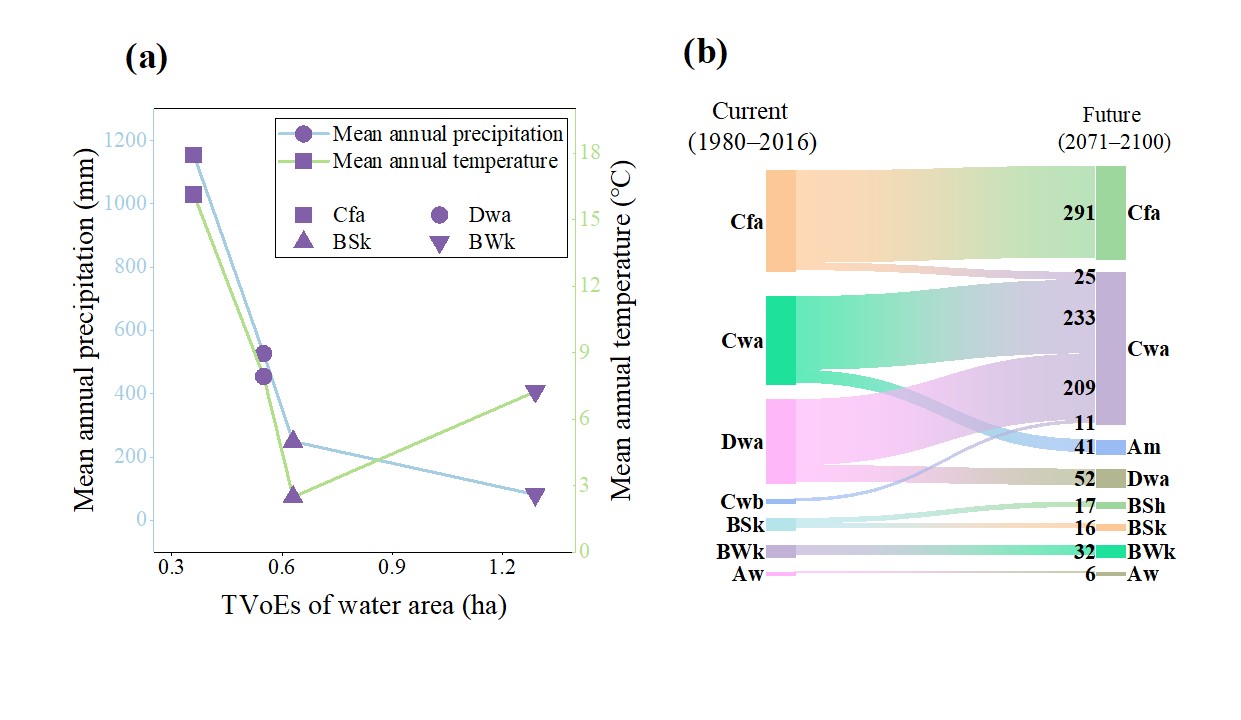 结果表明,不同气候区水体的降温效果呈现显著的空间异质性,热带和亚热带湿润区的降温面积、降温效率和降温强度均高于干旱区。水体的景观结构是影响各气候区水体冷却效果的主要因素(超过44%)。与气候因素相比,人为因素在湿热气候区更为重要,而在寒冷沙漠区,气候因素则比人为因素更重要。进一步,研究量化了全国范围内不同气候区水体冷却效应的阈值,发现全国平均水体冷却面积为0.34 ha,冷却周长为0.51 km,并且水体冷却效率阈值随着降水量的减少而增加。未来在RCP8.5情景下,2071-2100年期间,超过33%的城市水体(主要位于华北平原和东北平原)将面临重要气候转变,其冷却效应和冷却效率阈值可能将降至亚热带甚至热带湿润区水平。这些发现为更好地理解水体的冷却作用、提高城市韧性和缓解不同气候区的极端气候影响提供了定量指导。