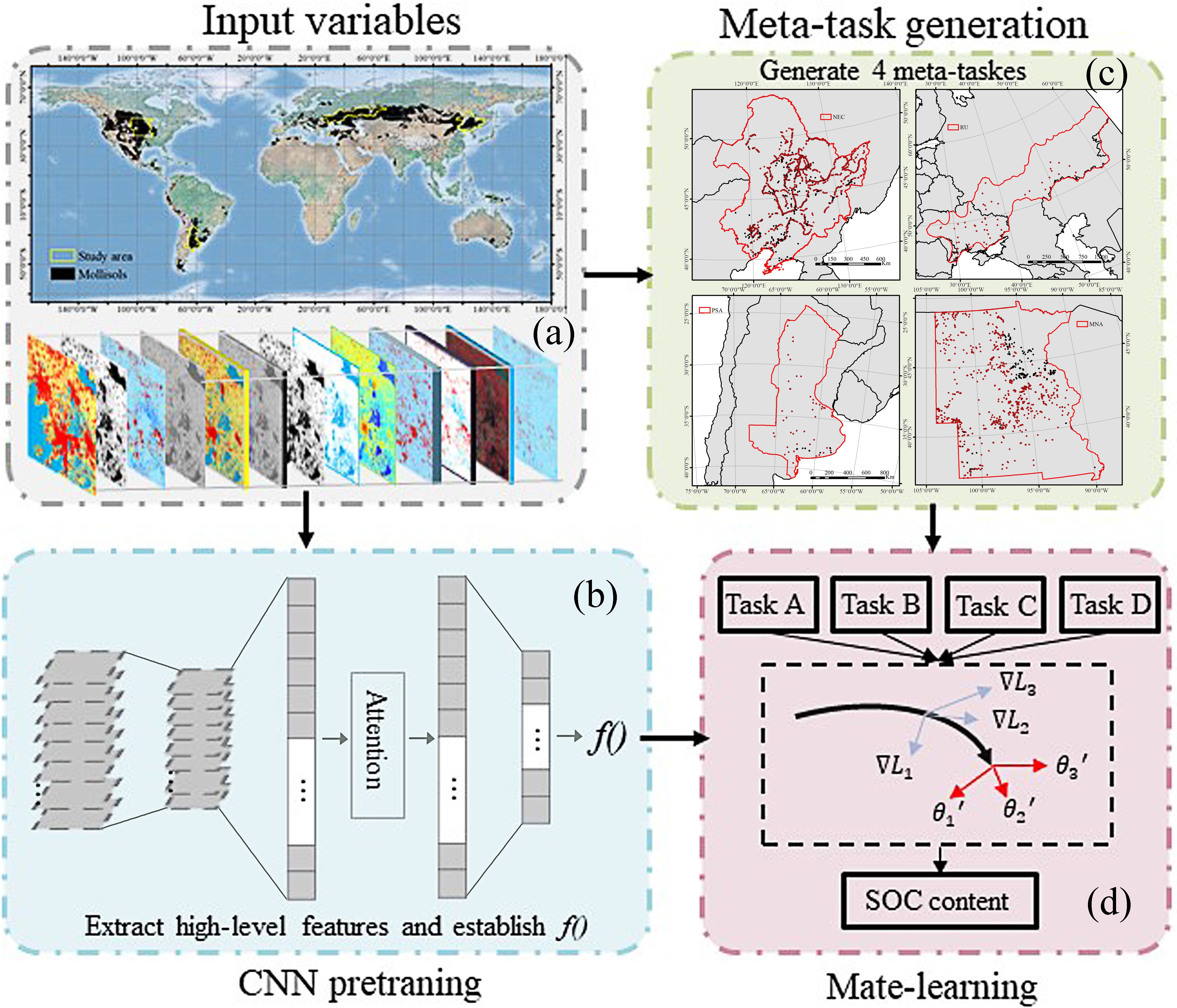 为解决上述问题,中国科学院东北地理与农业生态研究所农业遥感学科组研究人员在遥感大数据和云计算平台(Google Earth Engine)的支持下,收集了191465幅Landsat TM和OLI影像以及高程模型数据,计算了基于土壤成土模型、表征土壤形成信息的光谱指数。其次,提出了局部策略(LS),以降低土壤有机碳含量的高异质性和环境变量对预测结果的影响。更重要的是,首次构建了元学习卷积神经网络(ML-CNN)模型,为小样本任务提供了更高的预测精度,并用于生成高空间分辨率全球黑土区域SOC含量数据集(GMR-MCNN)。