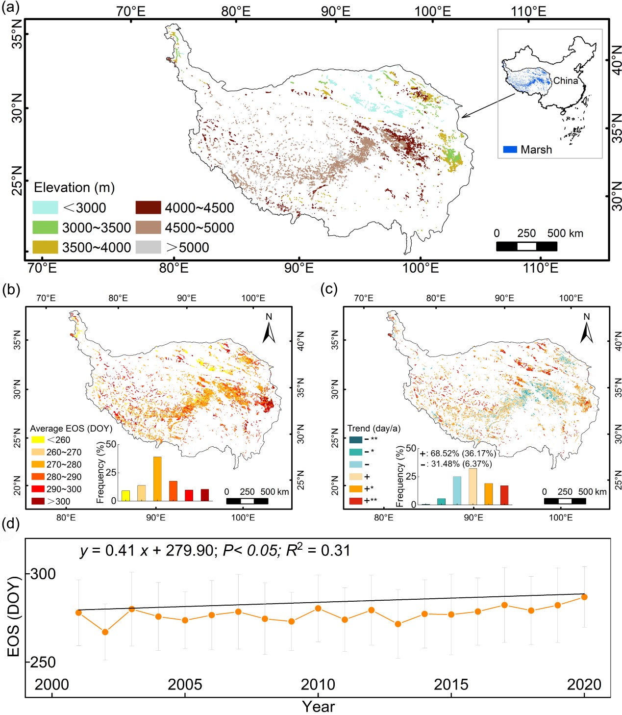植被物候是生态系统响应气候变化的敏感指标。在全球气候变化背景下,植被物候变化会影响生态系统碳循环及水热平衡过程。作为世界上海拔最高的高原,寒冷干旱的青藏高原植被物候是受温度还是水分主导仍然存在争议。青藏高原有大面积的沼泽湿地分布,沼泽相对充裕的水分条件为进一步揭示这一问题提供了理想的条件。明确青藏高原沼泽植被物候时空变化及对气候变化响应机制,能为预测区域碳循环、揭示植被与气候变化关系提供科学依据。