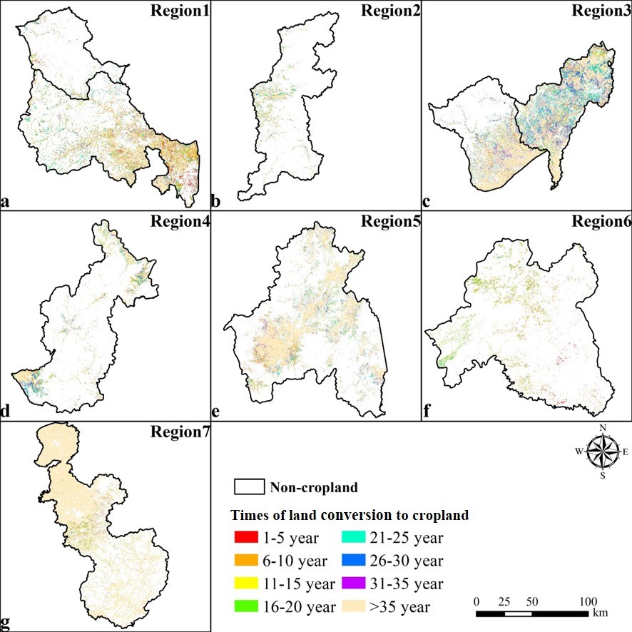 随着人口和对粮食需求的增加,越来越多的自然土地被开垦,可开垦土地的坡度也越来越大。但坡度越大,土壤侵蚀的风险越高,对SOC含量影响也将愈加严重。本研究针对东北山区土壤开垦对SOC的影响进行定量化分析。研究从大兴安岭、小兴安岭和长白山脉选择了7个地市作为研究区,基于东北地区829个旱田表层土壤样本,同时,在GEE云平台获取Landsat影像,通过土地利用数据提取不同开垦年限的边界,使用概率混合随机森林模型完成SOC制图。得到山区土壤不同开垦年限对SOC的影响。研究表明,山区土壤开垦主要来源于林地,最大开垦比例约70%,但在2015年以后,主要来源于草地,开垦比例超过50%;山区SOC以平均每5年0.30g kg-1的速度降低,而开垦的坡度则以平均每5年0.35 的速度增加;林地开垦31-35年导致SOC降低了2.04 g kg-1,但裸地开垦导致SOC升高了4.07 g kg-1。山区土壤开垦对SOC具有消极影响,自然土地开垦应该被控制和保护。
