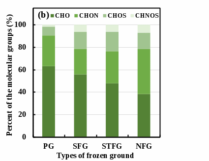 目前很多研究都采用傅里叶变换离子回旋共振质谱(FT-ICR-MS)等方法分析湖泊中DOM的分子组成,然而,对不同冻土区湖泊DOM的空间变化和分子组成的了解仍十分有限。中国科学院东北地理与农业生态研究所水环境遥感学科组科研人员对全国616个湖泊的水体DOM进行了调查采样,率先对不同冻土区湖泊DOM的分子组成进行了比较研究。结果发现寒冷区湖泊水体溶解性有机碳含量(DOC)明显高于温暖地区湖泊,永久冻土区湖泊DOC均值最高(21.4±19.3 mg/L),该区域湖泊可能是碳转运加工的重要枢纽;所有湖泊水体DOM分子都以CHO化合物为主(40.1%— 63.1%),该比例随着湖泊所处温度的增加而呈下降趋势(图1);与其它地区湖泊相比,永久冻土区湖泊水体DOM分子量较低、芳香性更低、分子易变性更高。全球范围内冻土融化现象频发,本研究结果为阐明冻土区湖泊DOM在未来全球碳循环中的作用提供了重要的理论支撑。