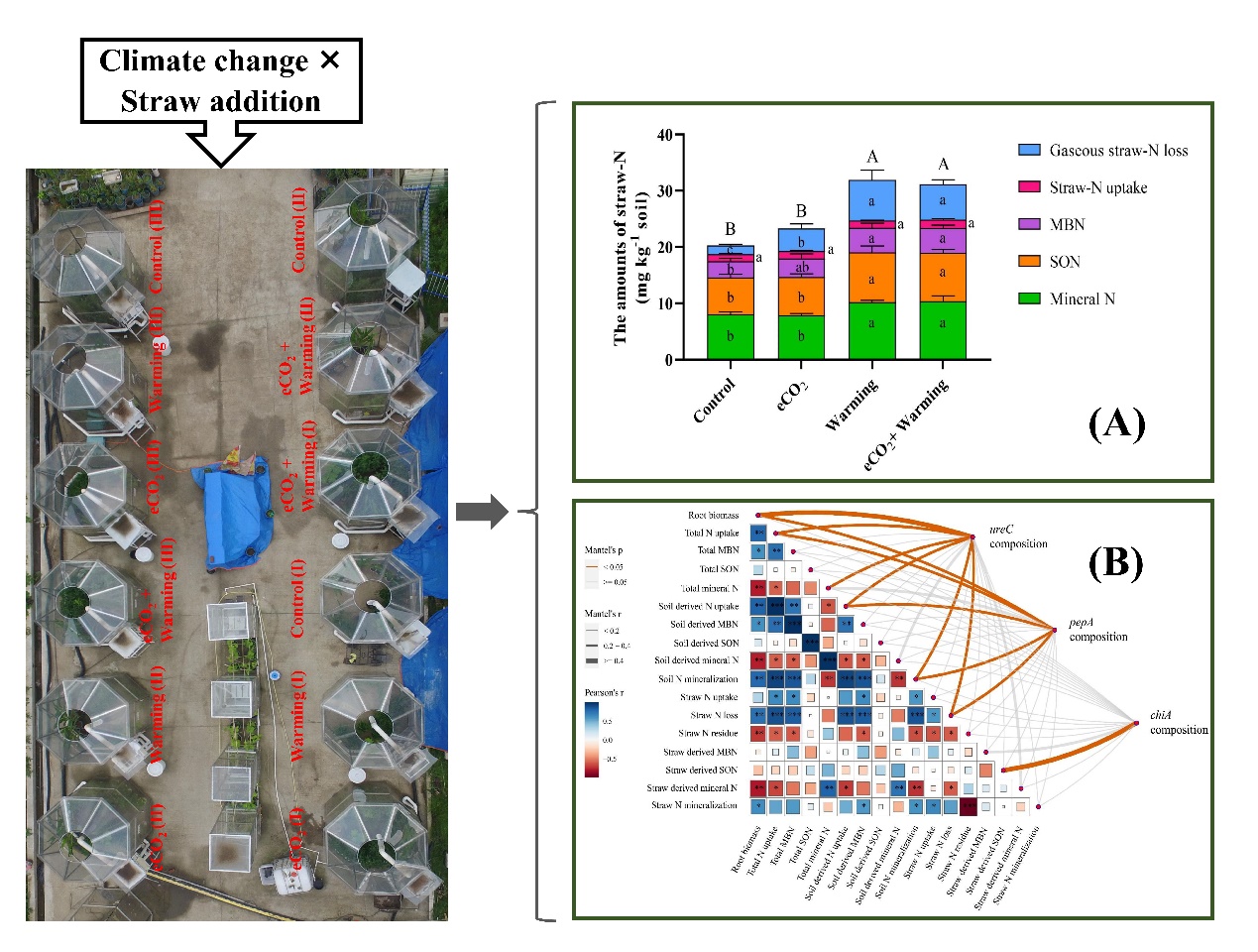 东北地理所农田分子生态学科组研究人员利用Open-Top Chamber (OTC)模拟大气CO2升高(700 ppm)和升温(比环境气温高2℃)条件,采用15N稳定同位素示踪技术和扩增子测序技术,设置添加15N秸秆以及无秸秆对照,探究大气CO2和温度升高对秸秆添加后秸秆氮矿化和水稻根际氮矿化微生物群落特征的影响。研究发现,大气CO2和温度共同升高虽然对水稻秸秆氮的利用效率没有显著影响,但可以显著增加根际秸秆氮矿化量和土壤氮矿化量,而且根际土壤氮矿化量显著高于秸秆氮矿化量。气候变化增加根际秸秆氮向微生物量氮、可溶性有机氮和矿质氮库中的转化(图1A)。在秸秆添加的条件下,CO2浓度和温度升高显著增加了亮氨酸氨肽酶(pepA)基因的丰度,同时显著改变了根际和非根际土壤中与脲酶(ureC)和亮氨酸氨肽酶(pepA)相关的微生物群落组成,并且与秸秆氮矿化以及土壤氮矿化均显著相关(图1B)。大气CO2浓度和温度升高通过改变水稻根际氮矿化酶合成相关微生物群落,加快了根际土壤氮和秸秆氮的矿化过程,并且添加秸秆不能有效缓解气候变化对根际土壤氮素矿化的促进作用。