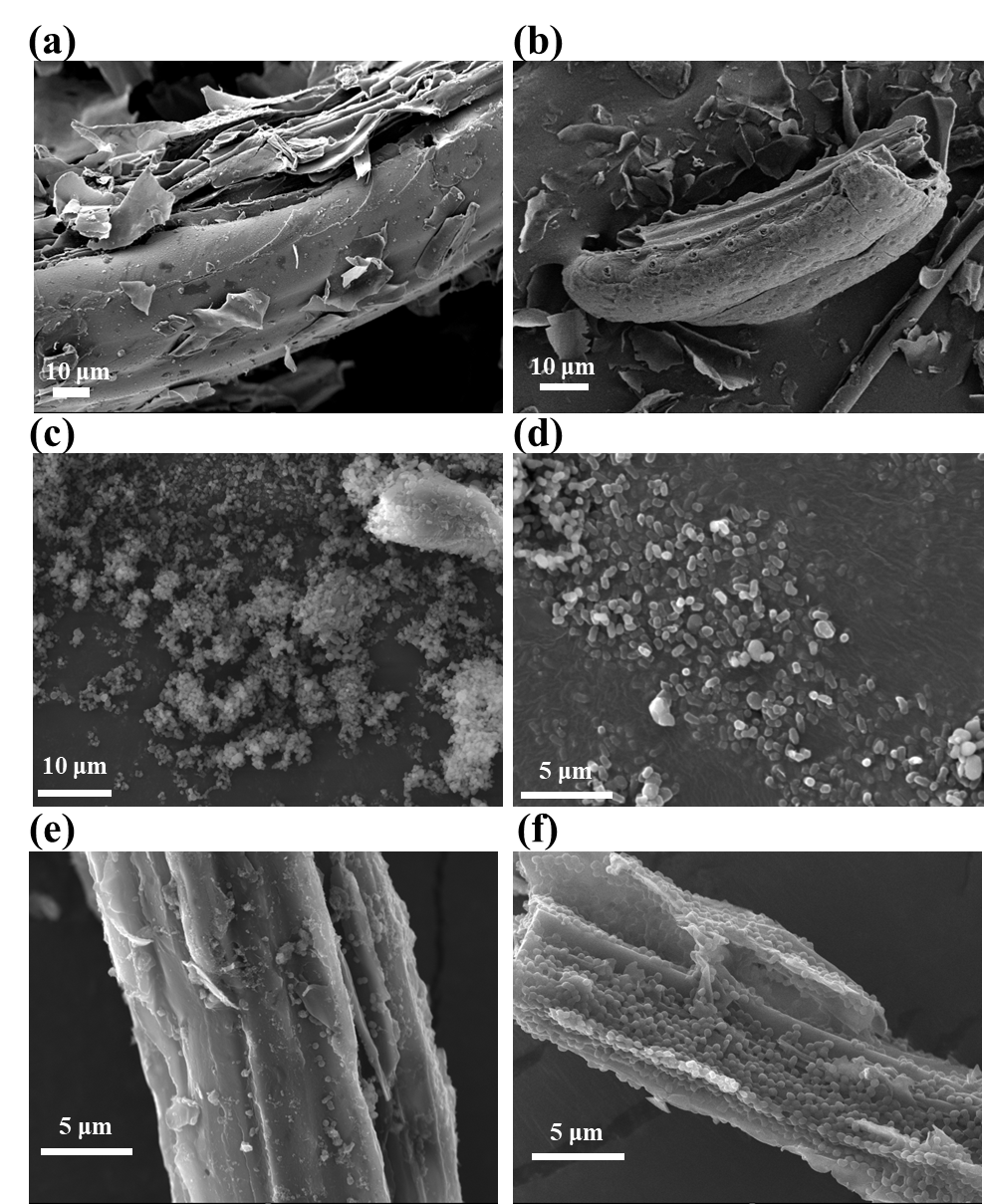 图1 原始生物炭(a)、改性生物炭(b)、Acinetobacter YH0317(c-d)、原始生物炭负载Acinetobacter YH031(e)和改性生物炭负载Acinetobacter YH0317(f)的扫描电镜图像