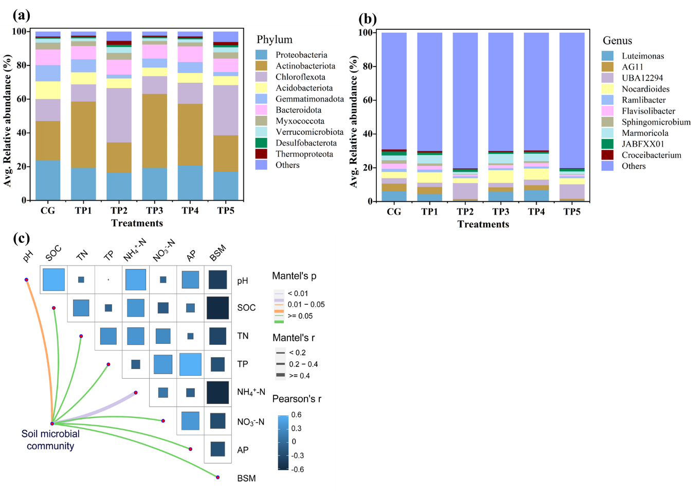 图2 不同处理组门(a)和属(b)水平微生物群落结构的相对丰度;土壤微生物群落结构与土壤性质的相关性分析(c)