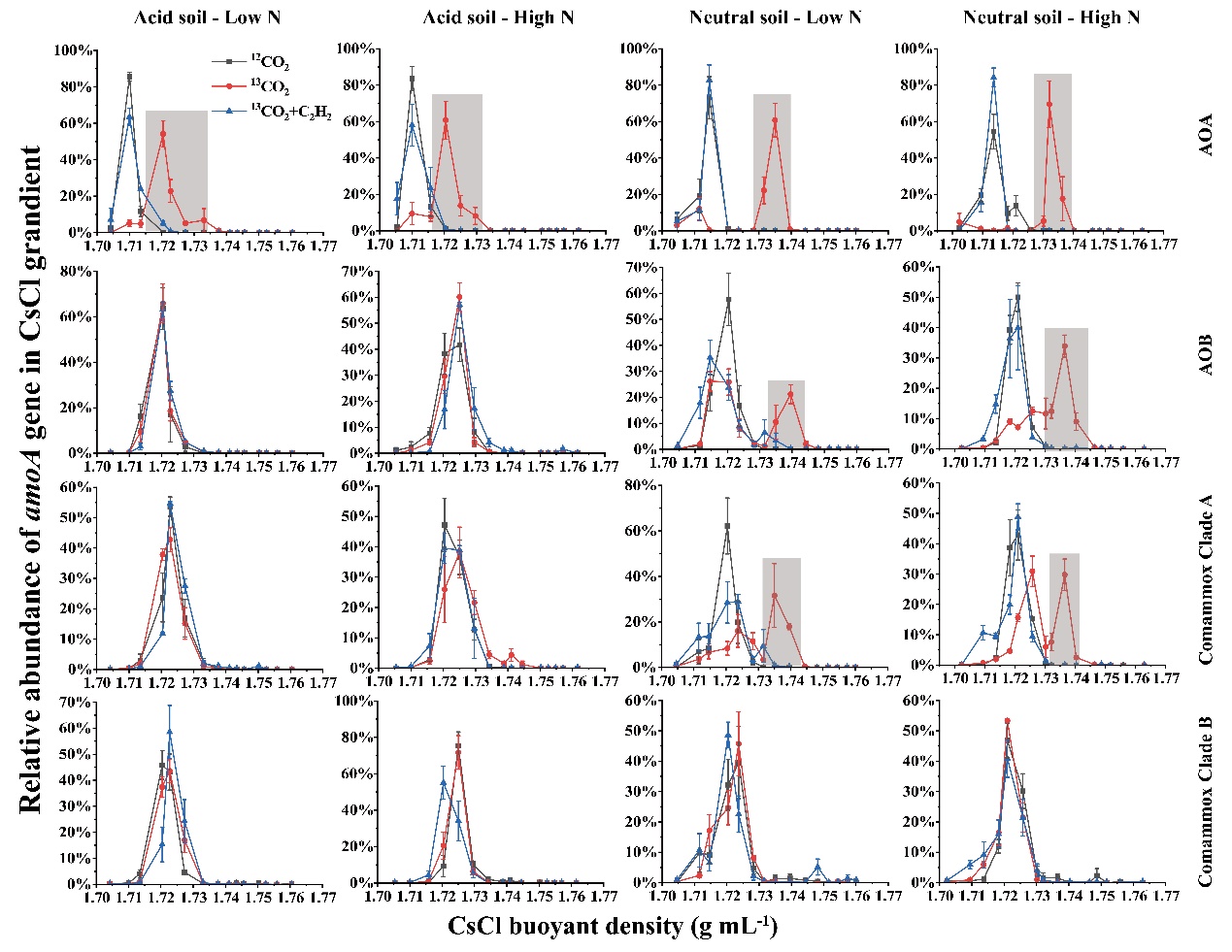 为此,东北地理所农田分子生态学科组研究人员利用13CO2-DNA稳定性同位素标记探针技术(13CO2-DNA-SIP)结合高通量测序技术,揭示出不同pH和NH3浓度处理下典型农田黑土中活性氨氧化微生物的种类和系统发育类群。研究发现,AOA主导酸性土壤的硝化过程,而AOA、AOB和Comammox Clade A共同参与了中性土壤的硝化过程。此外,在中性土壤中,AOB的硝化贡献随着底物铵离子浓度的增加而升高。构建的系统发育树显示,在酸性低氮、酸性高氮和中性土壤中参与氨氧化的AOA分别隶属于Nitrososphaera subcluster 1.1、Nitrososphaera subcluster sister 2和Nitrososphaera subcluster sister 1.1。在中性土壤中,参与氨氧化的AOB和Comammox主要隶属于Nitrosospira cluster 9和Clade A.2。本研究结果为认知东北黑土中三类自养氨氧化微生物的生态位分异提供了科学依据,对黑土氮素生物地球化学循环的管理具有重要意义。