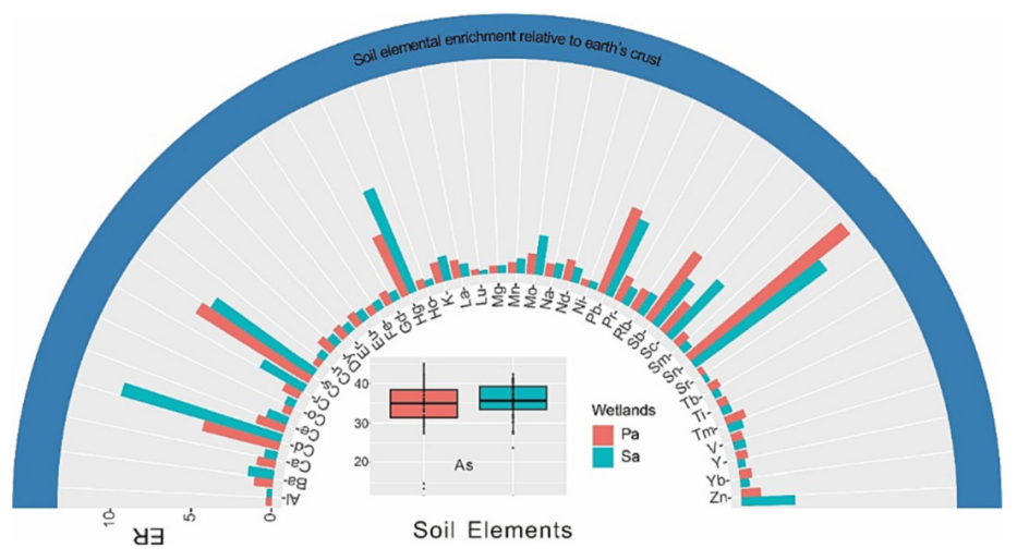 中国科学院东北地理与农业生态研究所湿地生物与环境学科组研究人员通过对全国典型滨海湿地互花米草与芦苇湿地进行系统调查,对比分析了两种湿地土壤中45种元素的地球化学集散状况,并基于相关性系数矩阵构建了量化多元素耦合程度的指标,探讨了互花米草入侵对滨海湿地多元素耦合状态的影响。