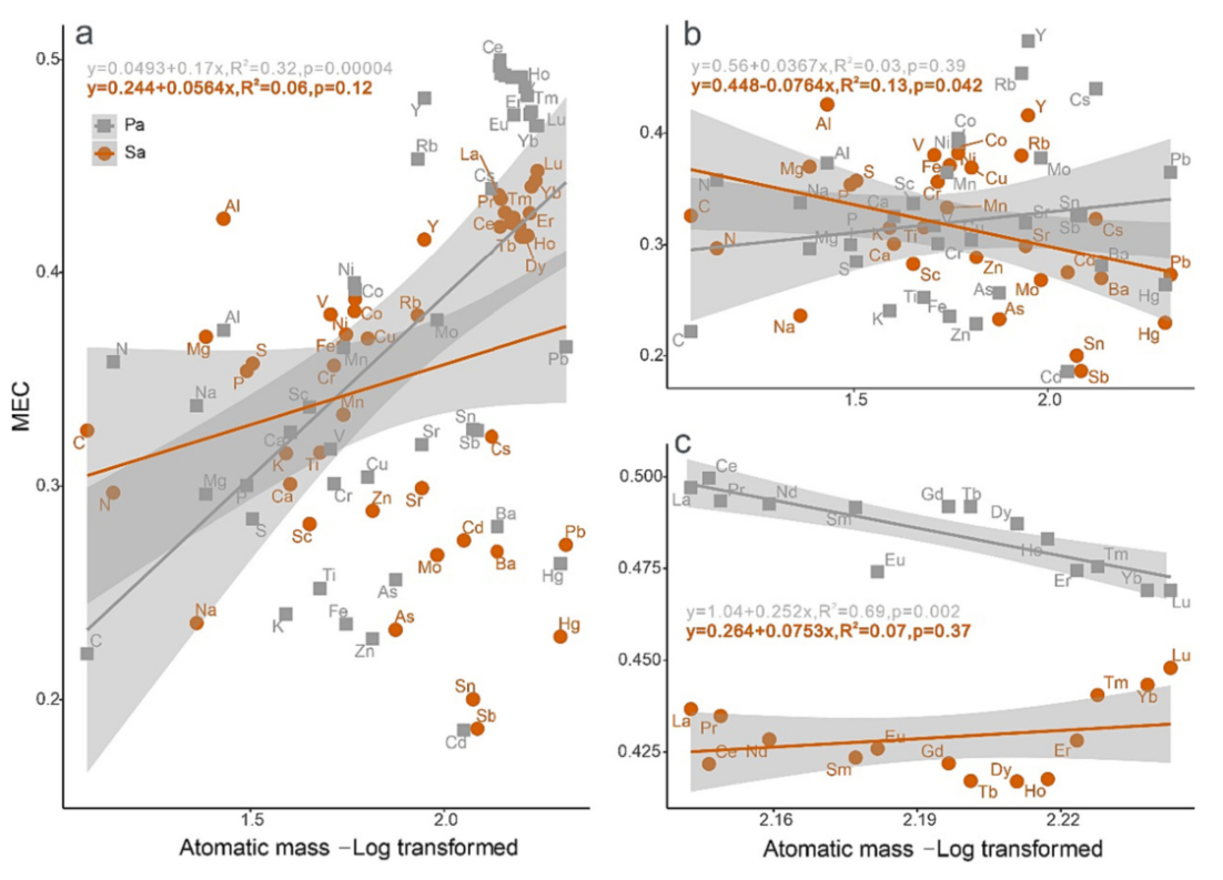 研究结果表明:互花米草入侵不仅重塑了多元素的地球化学集散状态,而且导致滨海湿地土壤多元素解耦。元素原子量是控制多元素耦合的主要因素,随着原子量增加,土壤中元素耦合程度增强。原子量与多元素耦合程度在芦苇湿地中显著相关,但在互花米草入侵后,这种显著相关性消失。与较重元素相比,原子量较低元素间的耦合更易受到互花米草入侵的影响,并且耦合程度通常被互花米草入侵所增强。互花米草与芦苇湿地中稀土元素耦合呈现出截然不同的模式。除了原子量之外,生物过程、海陆作用分别解释了多元素耦合的17%的10%变异性,生物过程与海陆交互作用共同解释了13%的多元素耦合变异性。本研究表明,在研究滨海互花米草入侵生态效应时,不仅需要关注其对碳循环过程的影响,也需要考察其导致多元素耦合过程的改变及其可能的多元素生物地球化学过程协同改变。