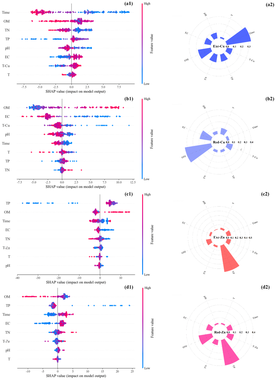本研究基于课题组15年的数据累积及外部数据的收集,共取得260组数据。以堆肥过程中常见的物质变化指标(堆肥时间、温度、pH、EC、OM、TP、TN和重金属总量)为输入因子,借助反向传播神经网络(BPNN)、梯度增强回归模型(GBR)、随机森林模型(RF),建立了堆肥过程中重金属形态快速预测模型,从而对重金属有效性进行评估。研究结果表明:BPNN、GBR和RF模型均能预测堆肥过程中Cu和Zn的形态分布(图1),其中RF的预测性能最好,R2值为0.93-0.97。同时,输入因子的特征性分析表明(图2),除堆肥时间外,OM和TP分别是预测Cu和Zn有效形态的最重要特征,降低OM或增加TP有助于提升堆肥中Cu和Zn的钝化能力。本研究识别了Cu和Zn生物有效形态之间转化的主要影响因子,为评估堆肥生产中重金属生物有效性评估及调控提供了一种快速的决策工具;同时拓展了人工智能方法在有机固废资源化领域的适用性,对于构建生态安全的种养结合、农牧循环新格局具有重要推动意义。