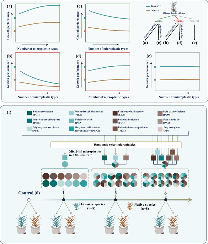 微塑料对植物造成的生态后果的不确定性与微塑料和植物种类的不同密切相关。如果不同类型的微塑料相互作用,那么多种类型微塑料对植物综合影响的复杂性将会被放大。外来入侵植物通常被认为比本地植物更受益于有利的环境条件,也往往更容易受到恶劣环境条件的影响。因此,微塑料多样性可能以不同方式影响外来入侵植物和本地植物的生长表现。基于以上研究背景,我们假设:(1)如果某些微塑料有利于植物生长,则当抽样效应占主导地位时,外来入侵植物可能比本地植物对微塑料多样性的增加做出更有利的反应;当稀释效应占主导地位时,外来入侵植物可能比本地植物对微塑料多样性的增加做出更不利的反应。(2)或者,如果某些微塑料不利于植物生长,则当抽样效应占主导地位时,外来入侵植物可能比本地植物对微塑料多样性的增加做出更消极的反应;当稀释效应占主导地位时,外来入侵植物可能比本地植物对微塑料多样性的增加表现出更小的消极反应。(3)如果在微塑料不产生任何影响的情况下,我们认为植物的表现将不受微塑料存在和多样性的影响,而外来入侵植物可能会比本地物种具有更高的生长表现。