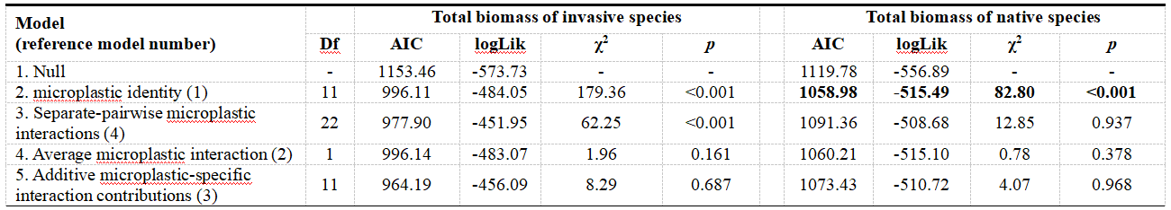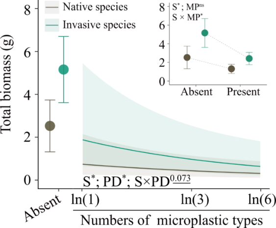 此外,通过hierarchical diversity-interaction 模型发现,微塑料多样性对外来入侵植物总生物量的负面影响既受微塑料性质的影响,也受某些类型微塑料的影响,两者之间存在强烈的配对相互作用。相比之下,对本地植物的影响则完全取决于微塑料性质(表1)。