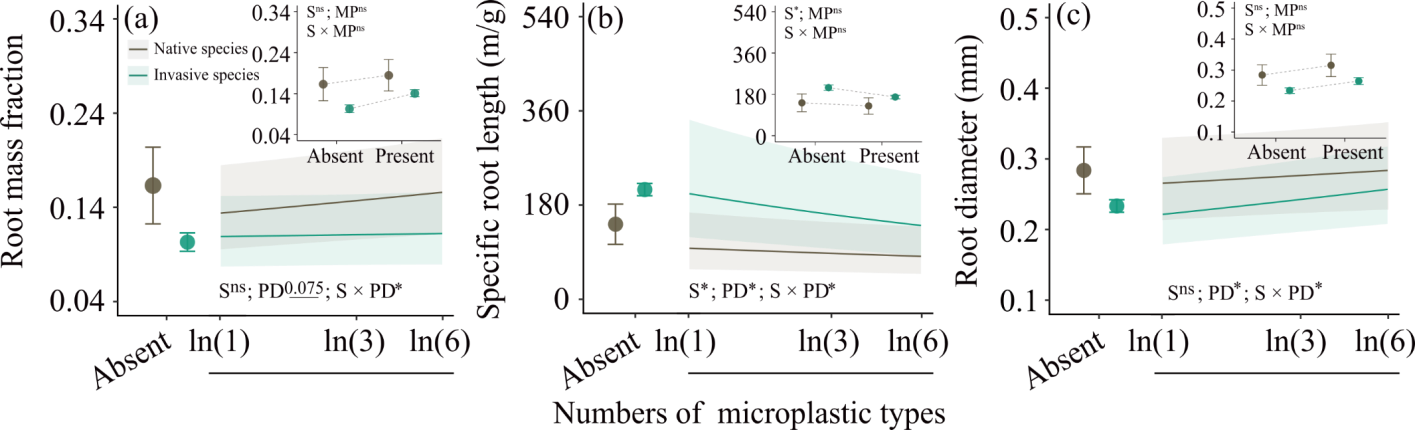 图3 微塑料多样性水平下外来入侵植物与本地植物根质量分数(a),比根长(b)及根直径(c)