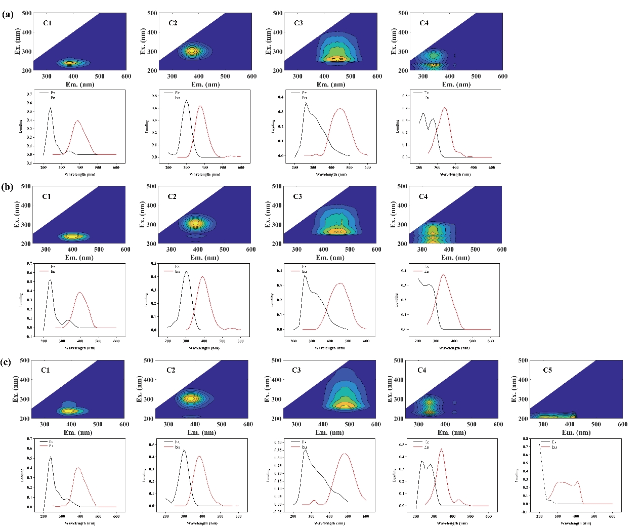 图1. 通过平行因子分析法(PARAFAC)确定的水溶性有机质(a),富里酸(b)和胡敏酸(c)的荧光组分