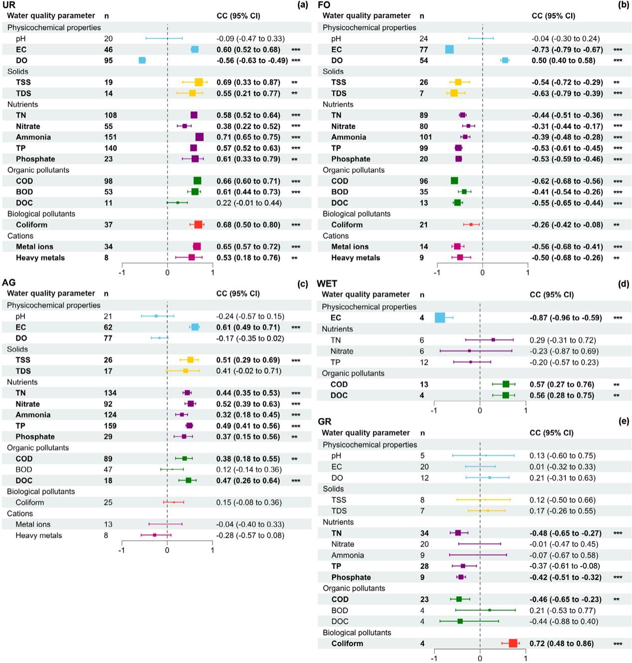 图2 不同景观组分变化对各水质指标影响的全球总体效应值