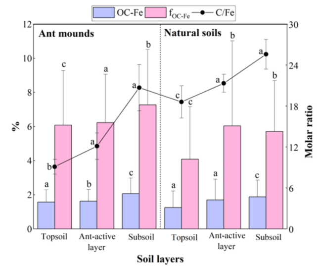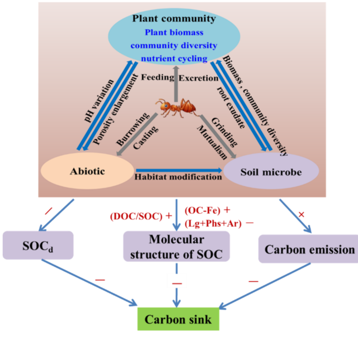 研究结果表明:蚂蚁入侵显著降低了土壤的有机碳密度和储量。蚂蚁丘CO2排放量显著高于对照土,蚁丘为CO2的源,但是同时也是CH4的汇。蚁丘土壤中代表土壤活性碳库的组分占比显著增高,代表化学保护作用机制的矿物有机碳复合体含量增高,热裂解化合物中不易分解的惰性组分占比显著降低。