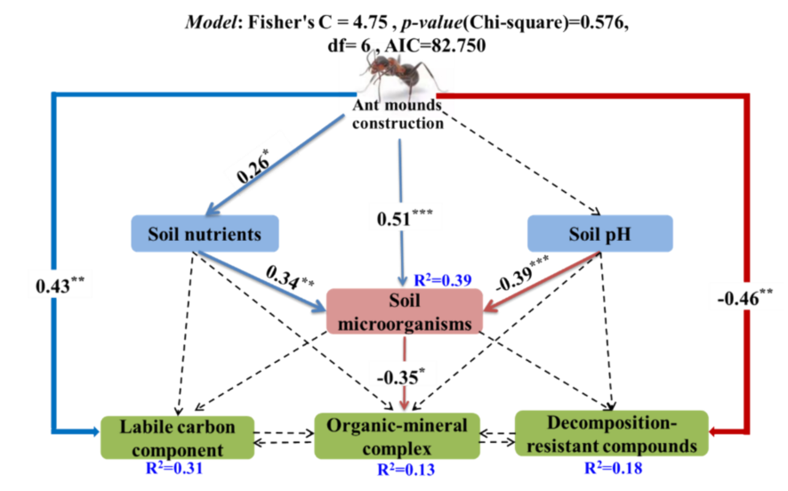 图3 蚂蚁入侵改变土壤碳库组分的SEM模型