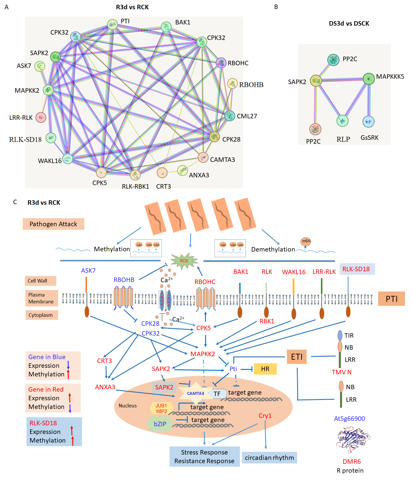 近日,东北地理所农田有害生物学科组李春杰研究团队采用先进的m6A测序和RNA测序技术,探讨了m6A修饰对基因表达和植物防御反应的影响。通过对大豆高抗品种和高感品种的对比研究,明确了m6A甲基化在大豆孢囊线虫病抗感基因型中的分布及动态变化。结果表明,大豆孢囊线虫侵染高抗品种后,上调和下调差异m6A峰(DMPs)的比例是1:22(205:4495);而在感病品种中,其比例接近1:1(1662:1774)(图1)。该结果说明SCN的4号生理小种侵染抗病种质后能够抑制大豆m6A甲基化修饰。结合转录组分析差异表达基因(DEGs)发现,关键的抗性和防御相关基因显示出上调表达和甲基化被抑制,包括抗性R基因、受体激酶和转录因子等重要调控元件。相反,在高感品种中,与感病性相关基因的表达增加且甲基化减少,包括霉菌位点O样蛋白(MLO)和影响防御机制的调控元件。通过对重叠的DMPs/DEGs基因的GO/KEGG富集分析,结合蛋白质-蛋白质相互作用,构建了抗病反应中的关键调控网络模型(图2)。在抗病品种中,有19个DMPs/DEGs互作,而感病品种中只有6个DMPs/DEGs互作。在抗病反应中,SCN侵染抑制了甲基化反应,却促进了与细胞受体激酶相关基因和抗性基因的表达。该调控网络模型(图2)揭示了SCN侵染能够抑制大豆m6A甲基化修饰,从而提高SCN防御相关膜受体和抗性基因的表达。甲基化模式与基因表达之间的动态相关性进一步解释了大豆对SCN的抗感机制。此外,研究还揭示了m6A修饰、可变剪接、microRNA和基因调控之间的复杂相互作用可能共同调控大豆的抗感反应。以上研究结果不仅有助于深入理解植物-线虫互作机制,还为开发新的线虫防控策略提供了重要的理论基础。