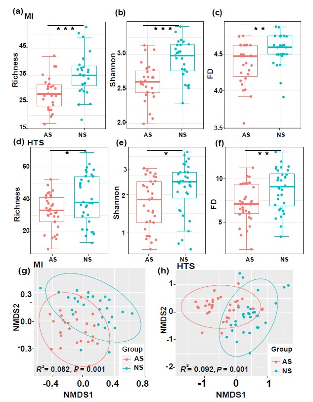 图1 农田(AS)和草地(NS)土壤中线虫的α多样性和β多样性。通过形态学鉴定方法(MI)和高通量测序方法(HTS)获得的物种丰富度(a,d)、香农多样性(b,e)、功能多样性(c,f)和非度量多维标度图(g,h)。