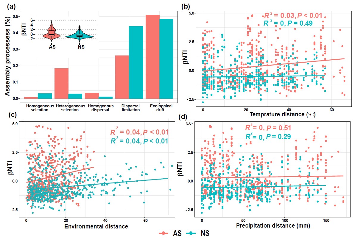 图2 农田土壤(AS)和草地土壤(NS)中线虫群落组装过程的影响因子。线虫群落组装过程对土地利用转换的响应(a)。线虫βNTI与温度距离(b)、环境距离(c)和降水距离(d)之间的关系。